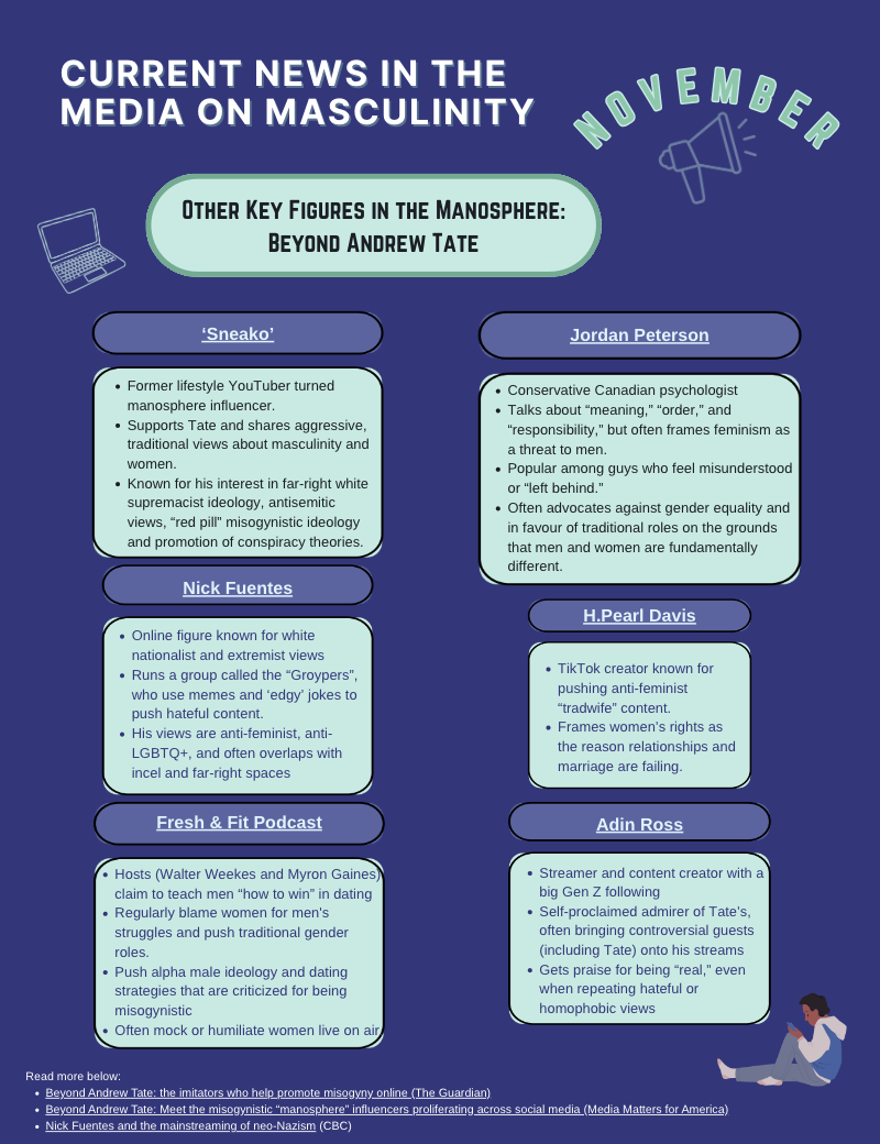 The manosphere is a loose network of online communities and spaces that produce and share content aimed at men and boys. While this content often claims to support men’s well-being or address common struggles for men, it often promotes harmful messages about gender, relationships, and masculinity.