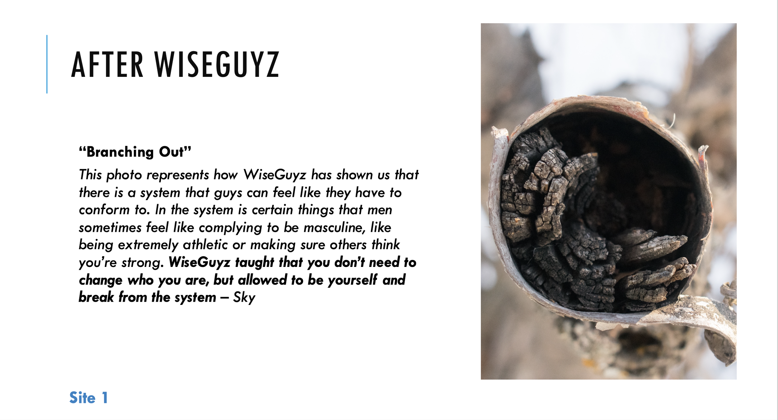 For this project, youth were asked to take photos/create art of what it means to be a guy in their world 1) Before WiseGuyz, and 2) After WiseGuyz. Youth photos/art are then used in individual interviews where youth lead the conversation and describe the meaning of their photos/art. From 2018-2024, we had 4 sites complete this project. Their art is showcased below. We have not included site details to protect participant confidentiality.